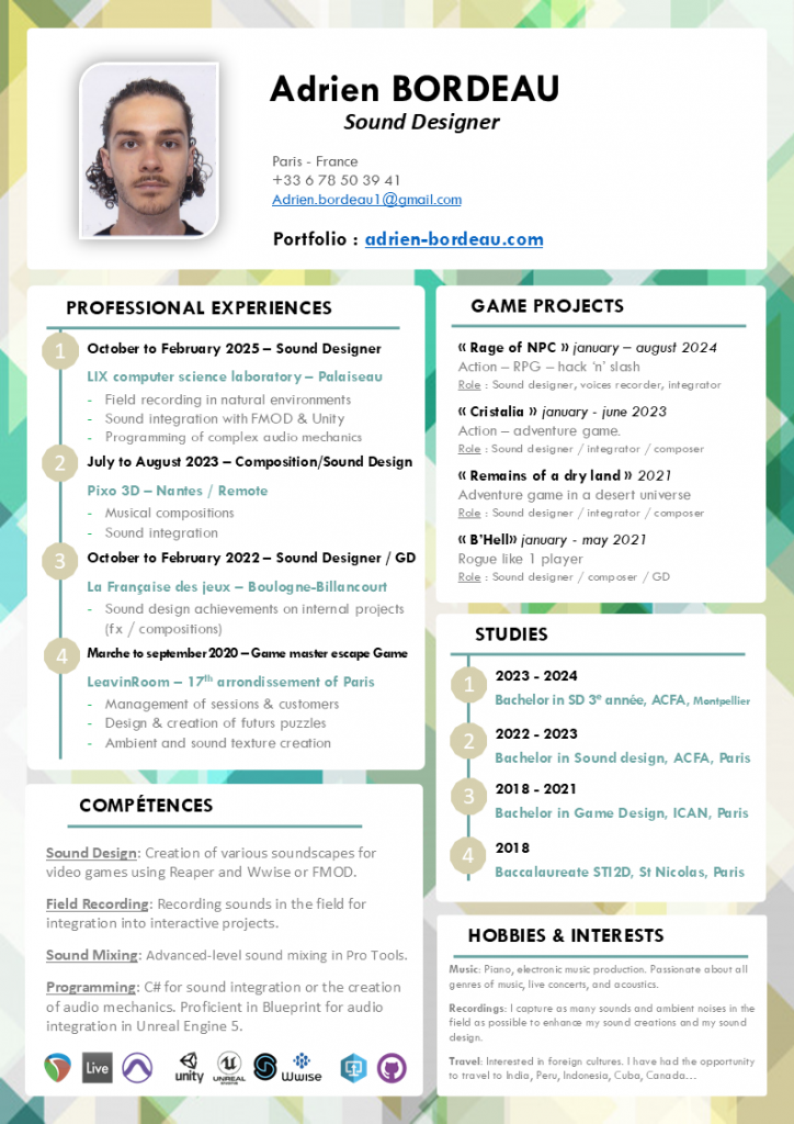 During this experience, I had the opportunity to work on various internal projects. My responsibilities encompassed the entire sound aspect, including sound processing and music composition.